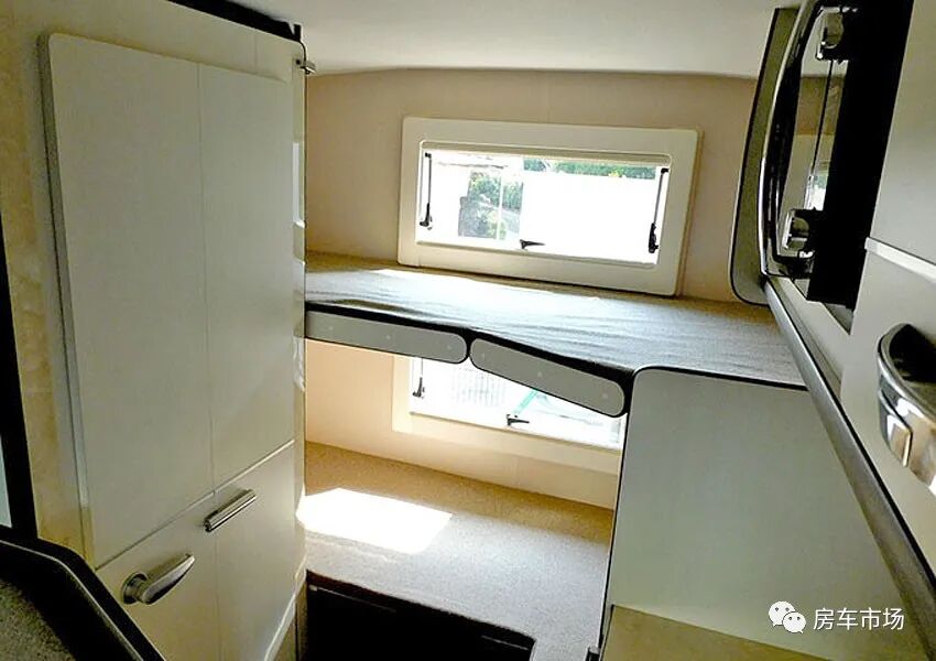 后部为横置单人上下床设计,尺寸为:1.8*0.7米,轻松睡下两人,后部各开有一个外推窗,驻车时可以打开通风透气。