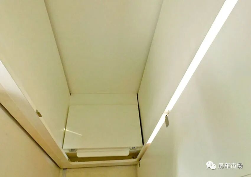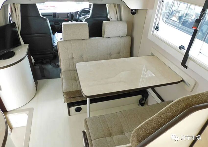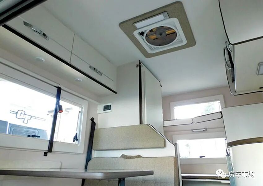 车内为白色家具,显得整洁干净。后部是横置上下床设计,前部是会客区,由两个卡座和桌板组成,中部设置的是独立卫生间和厨房,车内空间比较宽敞。