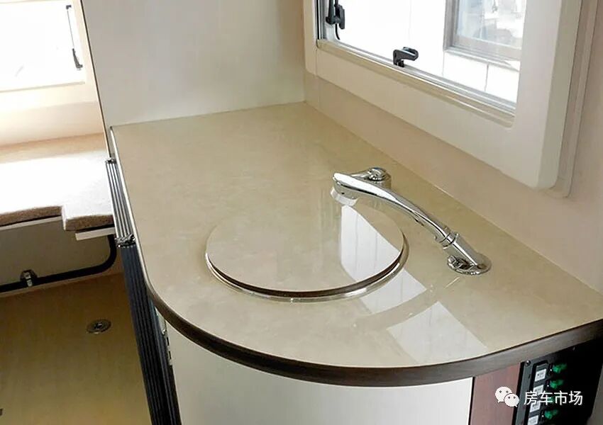 厨房在上车右手处,橱柜台面上设有不锈钢洗菜盆、可抽拉式水龙头,清水箱为20升,排水箱为20升,做饭使用便携式卡式炉,橱柜下方是一台车载冰箱,容量为60升,橱柜上还配有微波炉。车内热水来自伟巴斯通汽油型加热器。