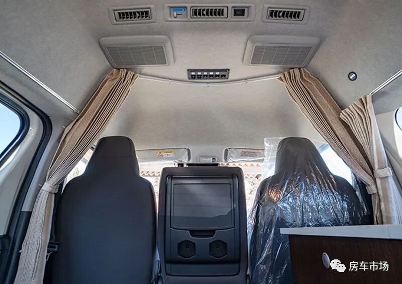 车内前部为正副驾驶独立座椅,门口上来对面是厨房,后部整个生活区设置了环形座椅,光线较好,四周设置了窗户,车顶部安装了储物的吊柜。