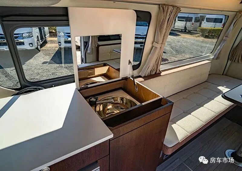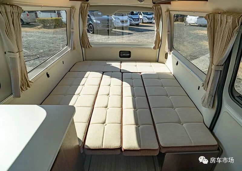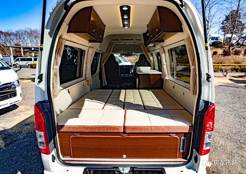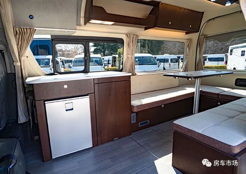 这台丰田海狮Hiace露营房车,后部设置环形沙发,会客区能容纳多人,内部简单配置成本低,满足两个人休息。国外售价约合人民币25万。