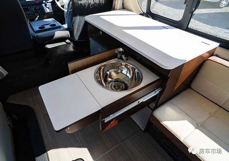 厨房为隐藏式设计,打开盖板可以看到洗菜盆和水龙头,使用时可以将其整体推出,和抽屉一样,清水箱和排水箱各10升,做饭使用卡式炉,橱柜下方是一台49升车载冰箱。