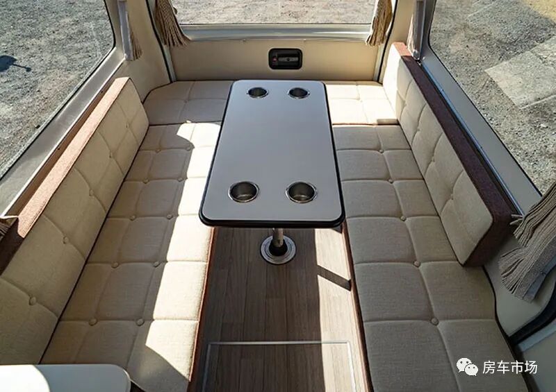 环形沙发中间可放置一张餐桌,全车亮点就在这,空间确实宽敞,能同时坐下5~6人,在这里可以就餐聊天。拿到桌板,放好床垫,拼成大床后尺寸能达到1.4*1.9米,睡下两人加一个儿童是可以的。