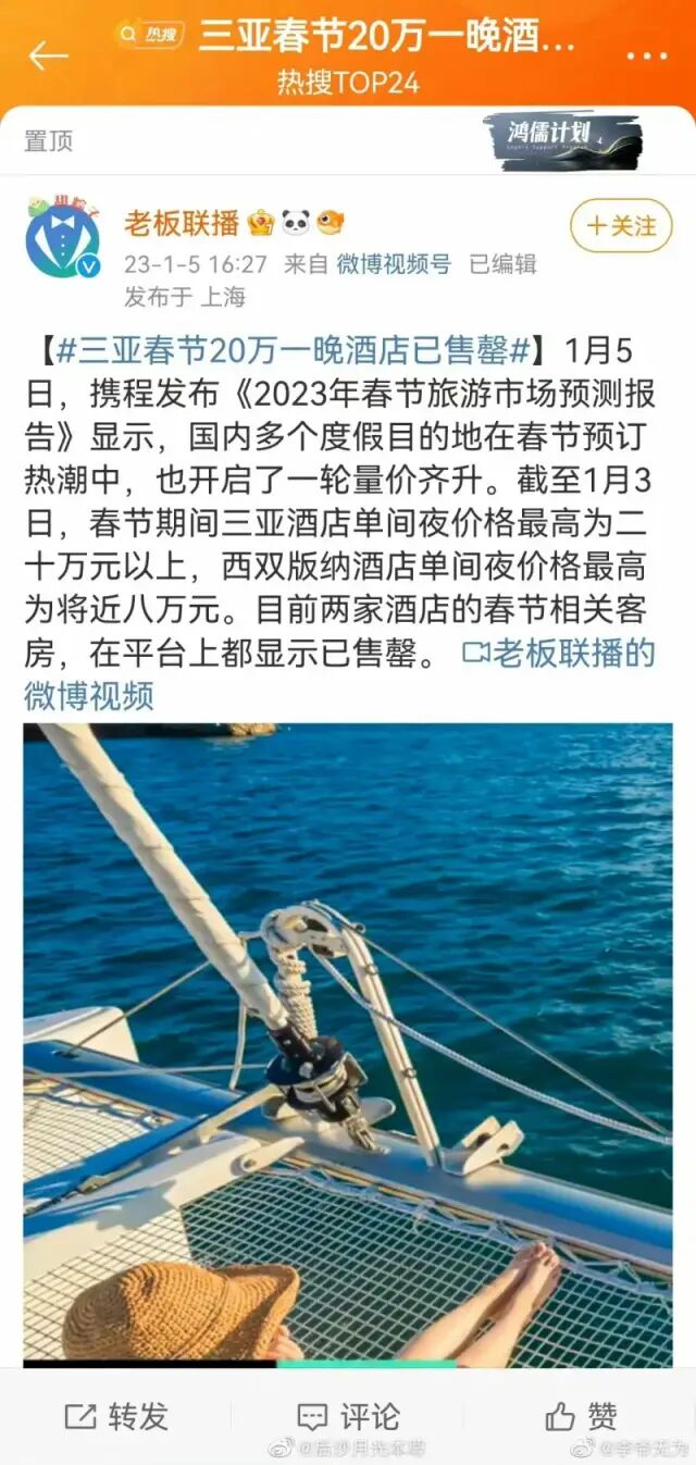 三亚春节20万一晚酒店已售罄1月5日,携程发布《2023年春节旅游市场预测报告》显示,国内多个度假目的地在春节预订热潮中,也开启了一轮量价齐升。截至1月3日,春节期间三亚酒店单间夜价格最高为二十万元以上,西双版纳酒店单间夜价格最高为将近八万元。目前两家酒店的春节相关客房,在平台上都显示已售罄。
