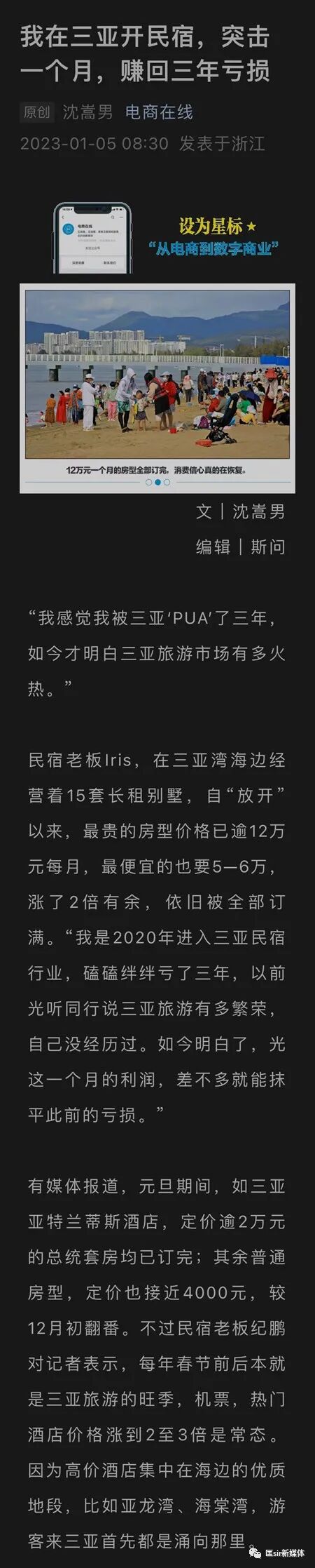 这两天被三亚酒店爆满,民宿爆满的,旅游火爆的新闻刷屏了,冬天的三亚确实很火,而且疫情三年,把人都憋疯了,刚一放开,三亚就被挤爆了。几万一晚的酒店都被抢空,民宿全部爆满,就连海滩上都躺满了晒太阳的喜羊羊们。近日一篇《我在三亚开民宿,突击一个月,赚回三年亏损》的文章火爆网络,文章作者:沈嵩男,文章写道:“民宿老板Iris,在三亚湾海边经营着15套长租别墅,自“放开”以来,最贵的房型价格已逾12万元每月,最便宜的也要5—6万,涨了2倍有余,依旧被全部订满。“我是2020年进入三亚民宿行业,磕磕绊绊亏了三年,以前光听同行说三亚旅游有多繁荣,自己没经历过。如今明白了,光这一个月的利润,差不多就能抹平此前的亏损。”