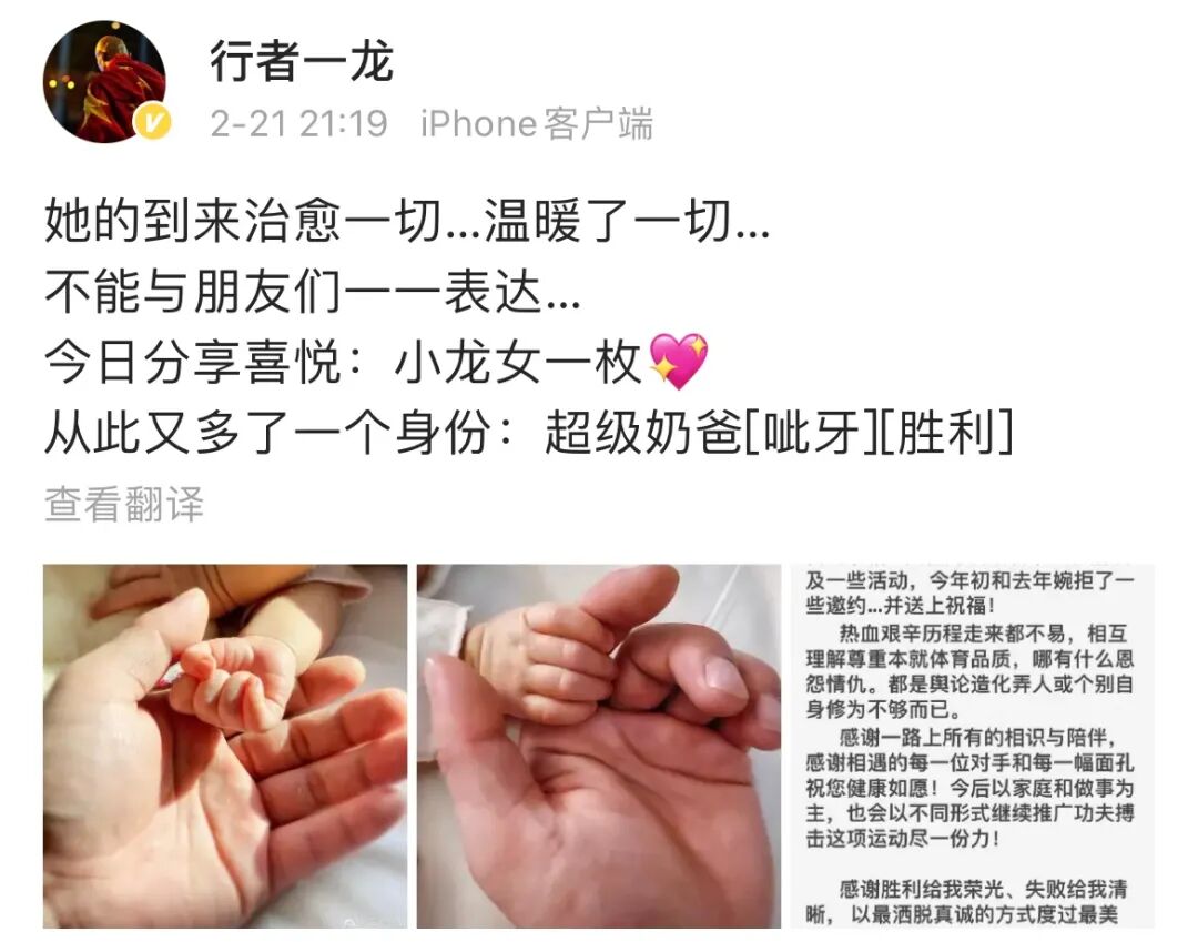 21日,一龙在社交媒体上公布自己喜得千金的消息。他说: