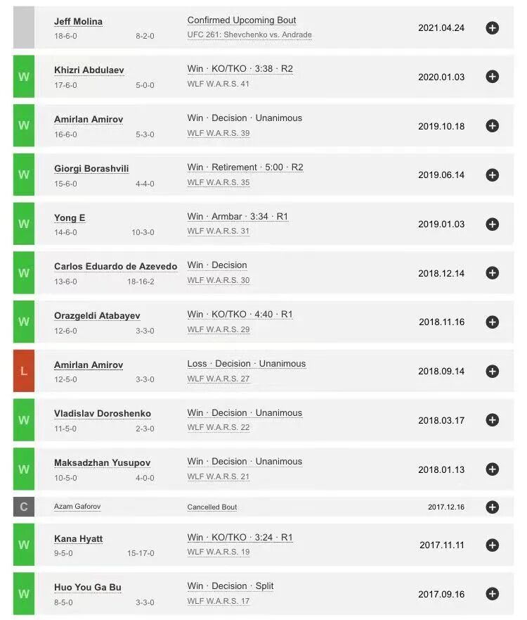 本次UFC首秀,傲日的对手是来自美国的杰夫-莫利纳。莫利纳出生于1997年7月17号,今年只有23岁,身高168臂展175。2015年参赛至今,业余战绩5战全胜4终结,职业战绩8胜2负,3次KO胜4次降伏胜,同时他还有着巴西柔术紫带的段位。