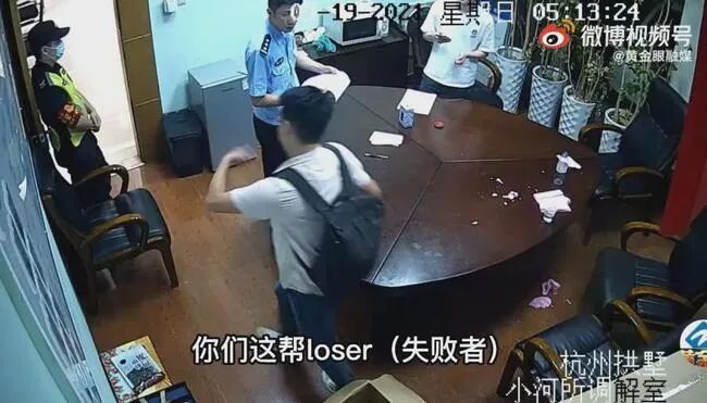 临走还冲着警察与前台小哥来了句“你们这帮Loser(失败者),你能怎么样”。随后大步流星地往外走。