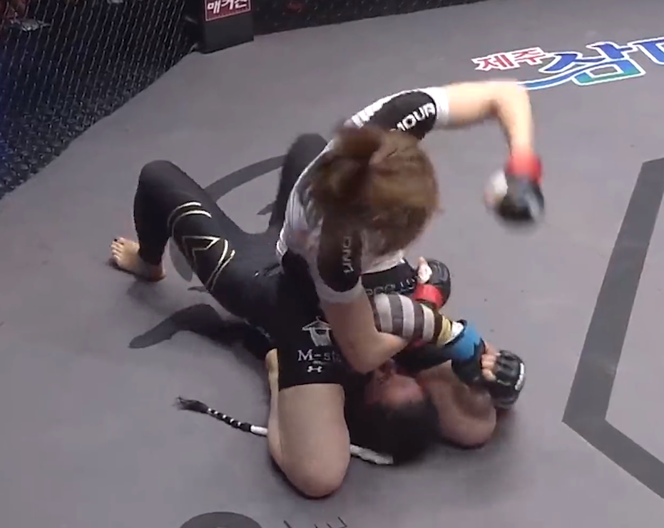 比赛开始后,红方拳手的进攻更是猛烈,在拼拳中抓到机会,直接将对手带入地面,而后的地面压制与打击毫不留情的砸向对手。