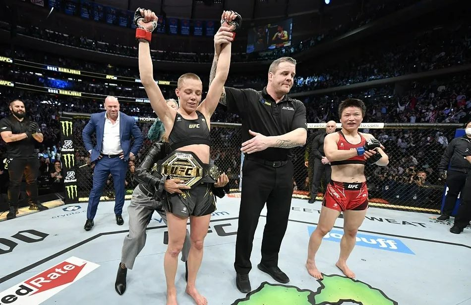 第五回合张伟丽体能下降,罗斯主动抱腿摔摔倒张伟丽长时间压制直到比赛结束。