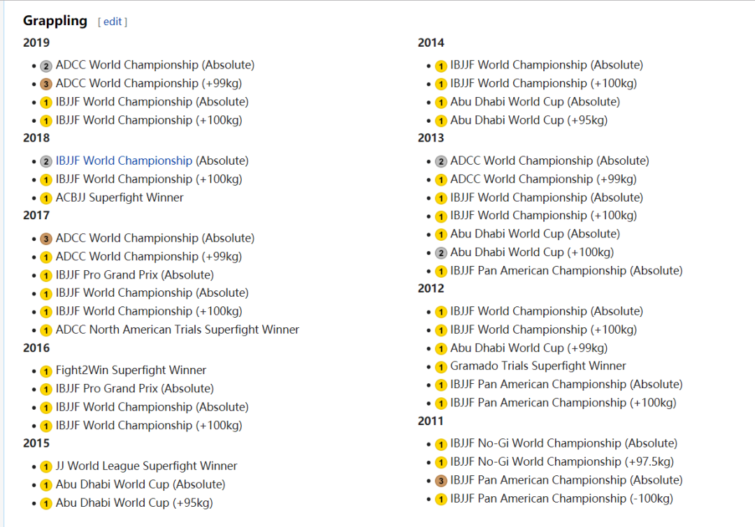 如果说起他在柔术圈取得的荣誉,真的可以讲上三天三夜,30岁的他在2011年开始参加国际柔术比赛,曾获得13次IBJJF世界冠军,2次ADCC世界冠军,看着这满满的金牌表格,加上142战128胜的战绩,没人敢怀疑他的地面缠斗技术吧。
