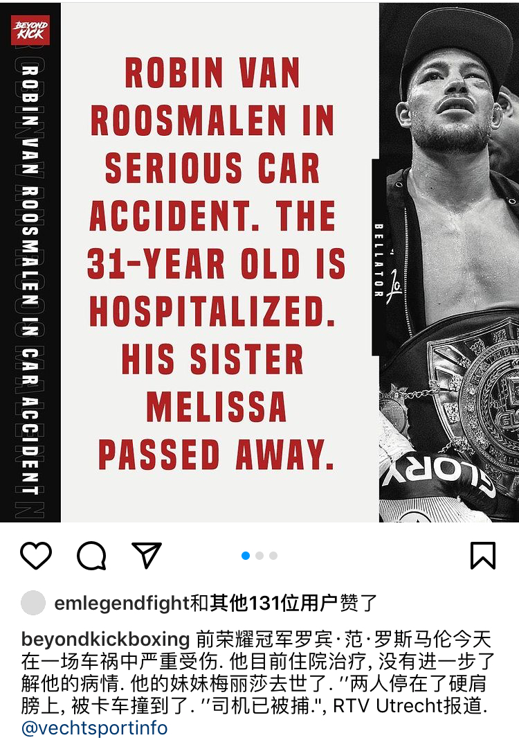 当地时间1月13日,前Combatpress 70KG世界排名第一、Glory前羽量级轻量级冠军罗宾-范-罗斯马伦(Robin van Roosmalen)在荷兰遭遇了一场严重的交通事故,在被送往当地医院抢救时发现罗宾身受重伤,他29岁的妹妹梅利莎(Melissa)死亡。
