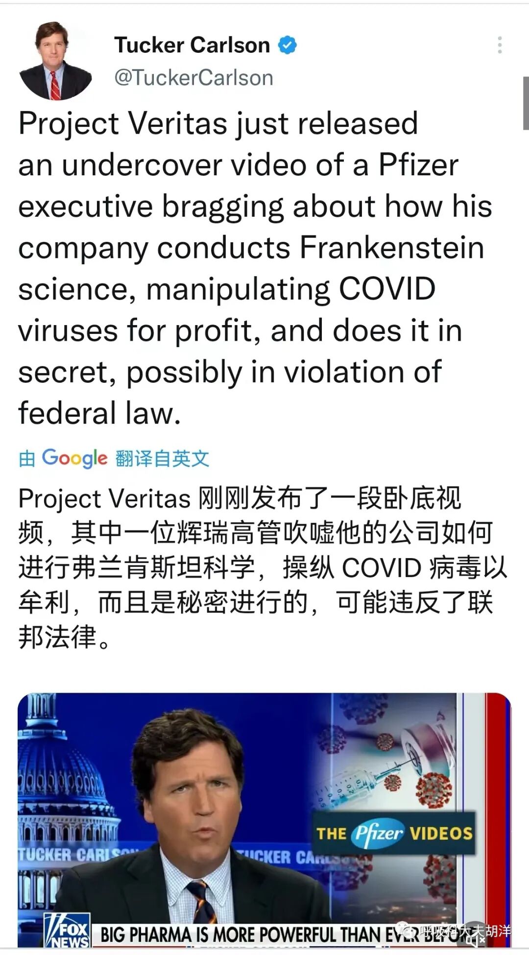 一个卧底偷拍视频引爆网络,疑似辉瑞关键部门主事人员在视频里透露辉瑞正在进行一个名为真相工程(Project Veritas)的项目,这个项目准备造一些新冠病毒变异株,这个变异株既要有一定毒力,但又不能过火,以维持目前新冠药物和疫苗的市场需求。