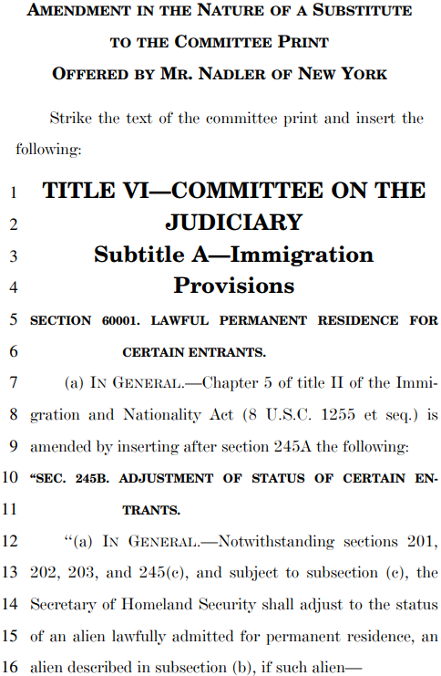 背景:2021年9月10日,众议院司法委员会发布了一份新闻声明:“主席杰罗尔德·纳德勒(Jerrold Nadler,D-NY)宣布了9月13日关于预算和解指示下的立法提案的委员会印证。”在成为法律之前,这些条款必须通过司法委员会、众议院和参议院,并由总统签署。