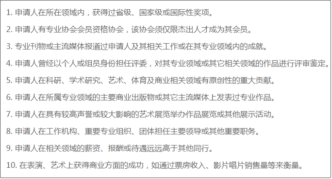 根据美国移民局对EB1杰出人才设定的条件范围,即具体衡量标准如下: