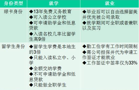 为什么越来越多家长选择先通过办理移民获得美国绿卡,再送子女赴美留学?请看下面这张对比图: