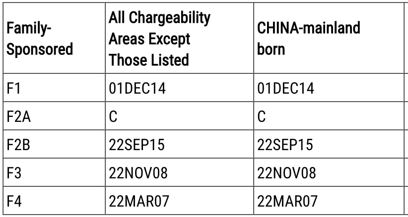 亲属移民类F2A类别无排期,其他类别排期集体原地踏步。