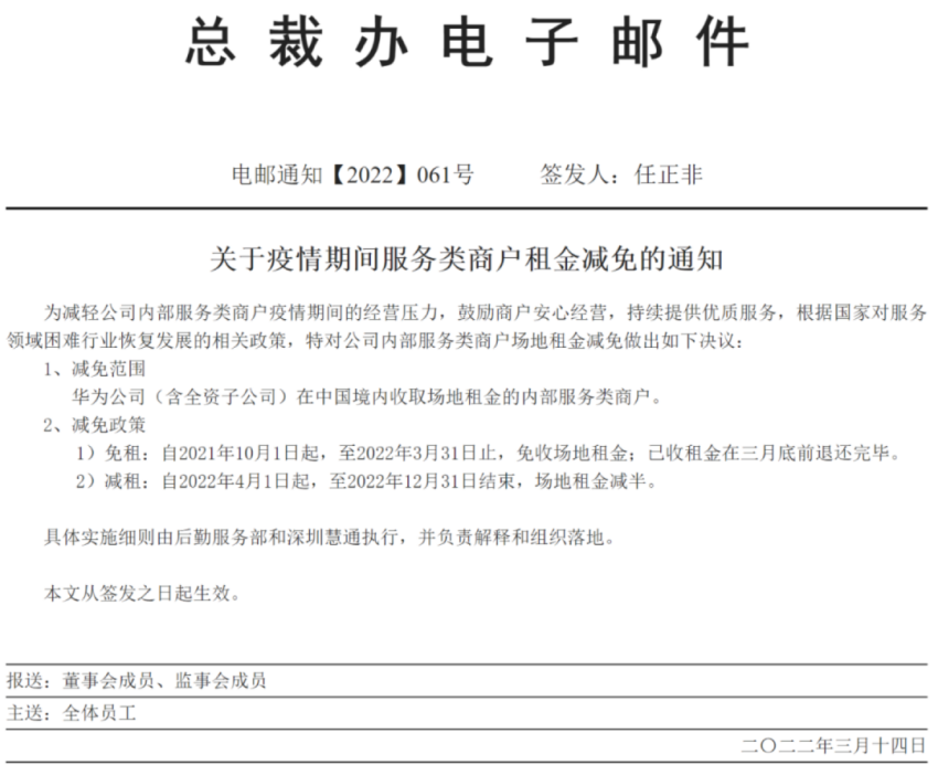 华为各园区的自有物业,给租户往前追溯半年免租,再往后9个月时间租金减半。