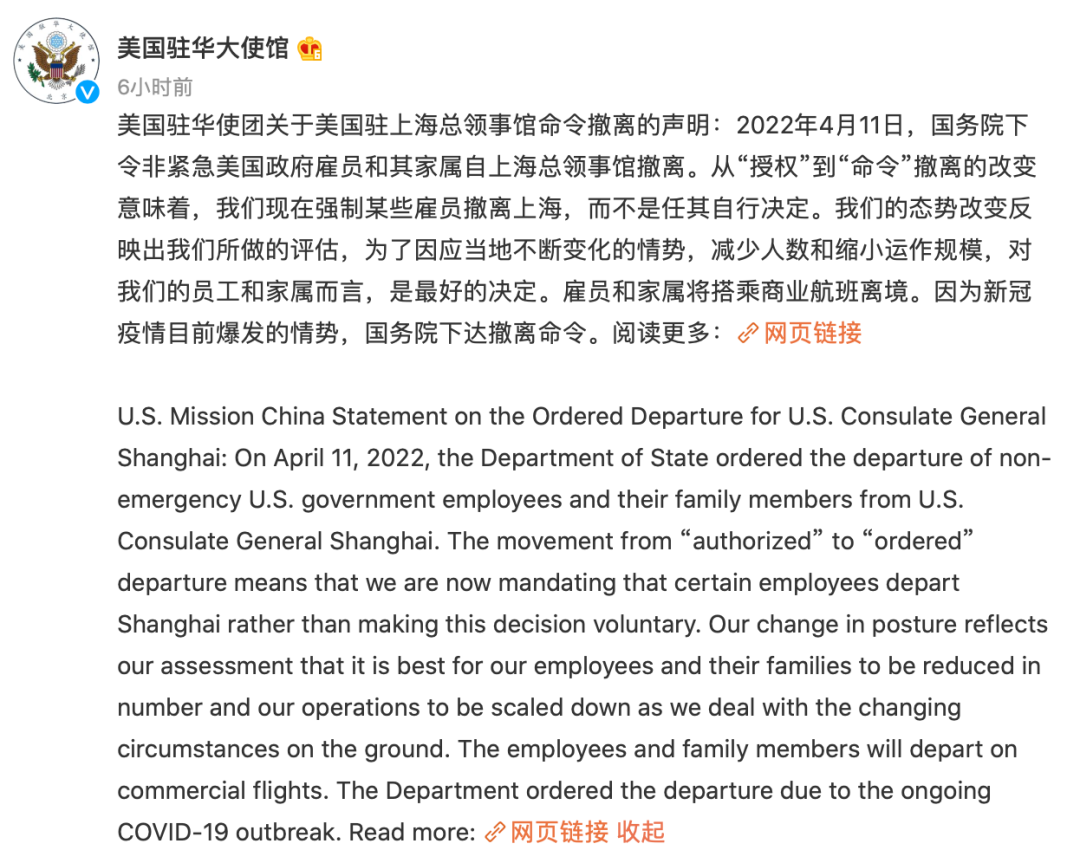 4月11日,美国宣布撤离上海领事馆的工作人员: