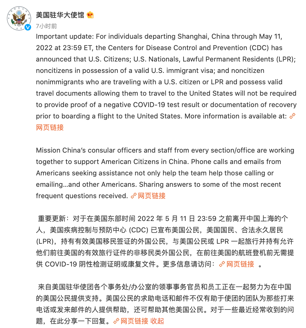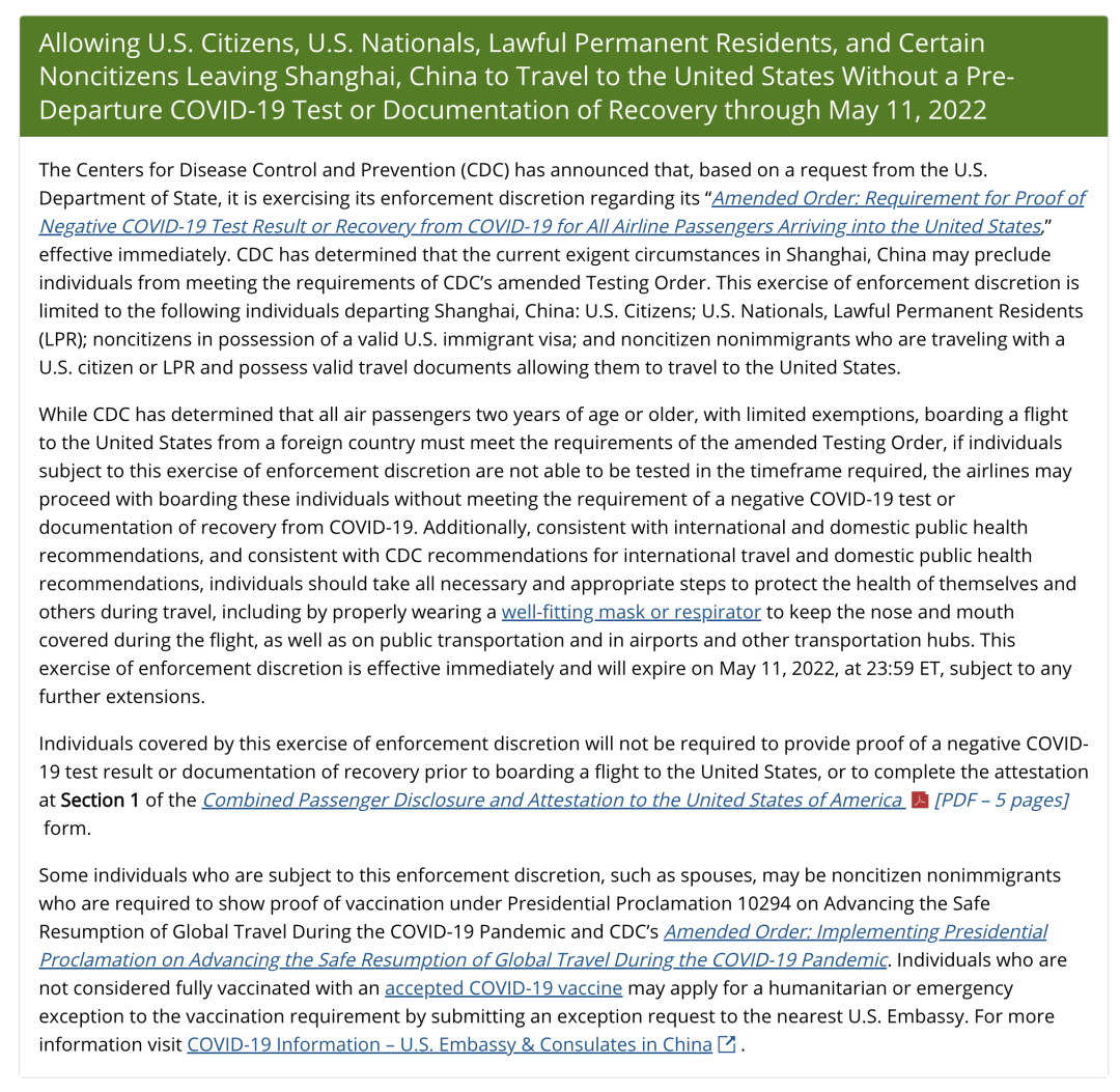 鉴于上海当前的紧急情况,应美国国务院的要求,所有美国公民、美国国民、合法永久居民等离开上海到美国时,无需提供之前要求的起飞前核酸检测。
