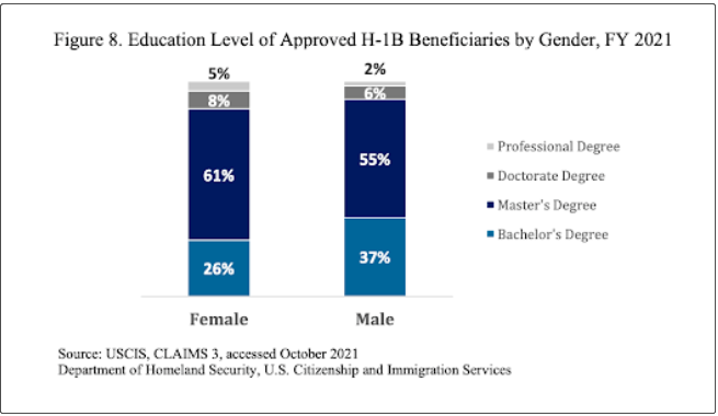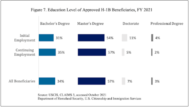大量H-1B专业人士都接受过高等教育,根据移民局的数据,在2021财年首次申请H-1B签证持有者中,近70%获得了硕士学位或以上学位。