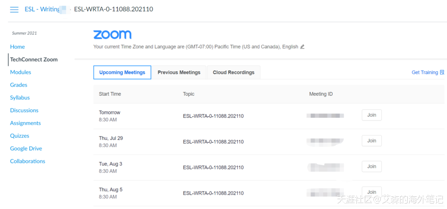 我的ESL(English as a Second Language英语作为第二语言)现在也是上网课,到了8月底就会回校上课,ESL是免费的,对应每个人的级别不一样,分为基本课、口语课、写作课。