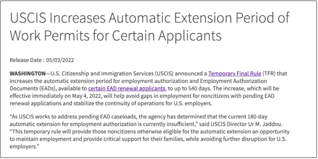 美国移民局宣布了一项临时最终规则(Temporary Final Rule):将部分EAD工卡类别的自动延期期限延长至540天。