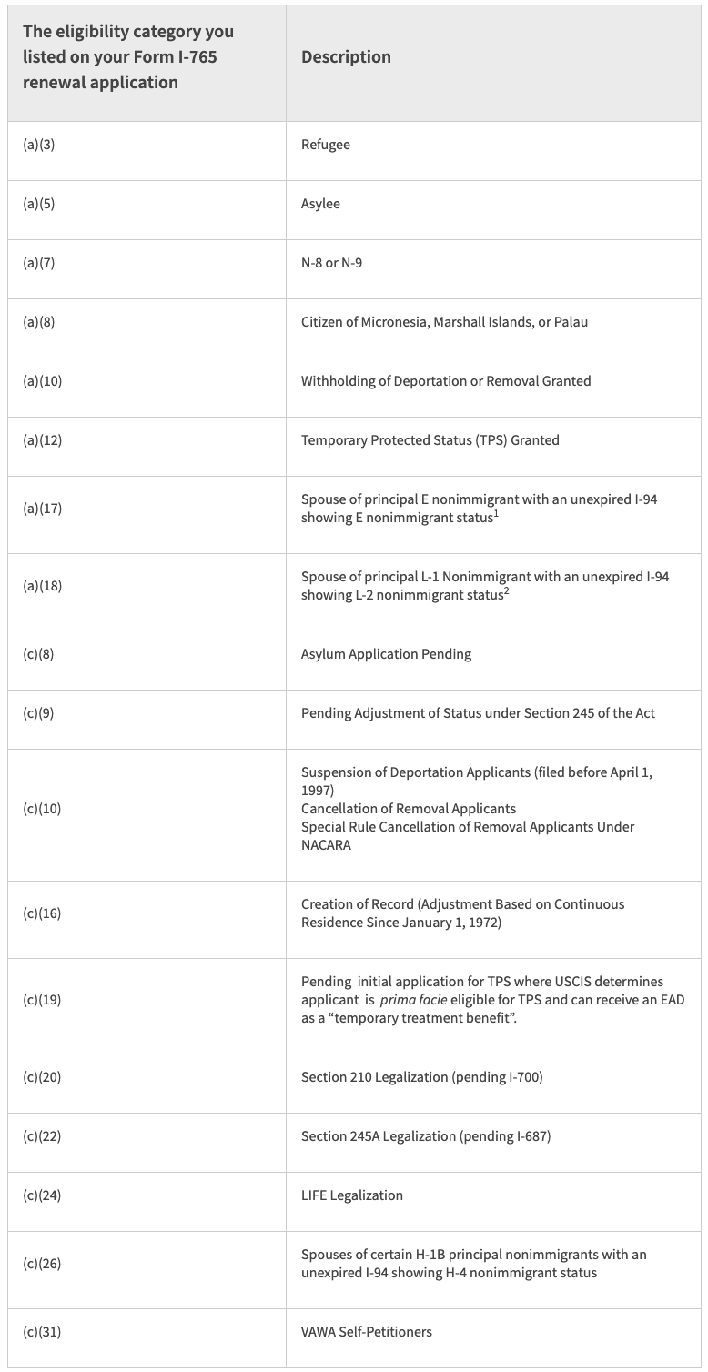 以下类别的工卡延期(Form I-765)申请人可获得自动延期: