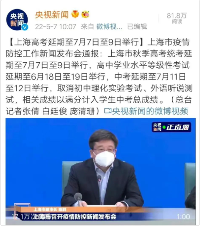 就是在这样的背景下,上海发布了一个重磅消息!上海高考、中考均延期。
