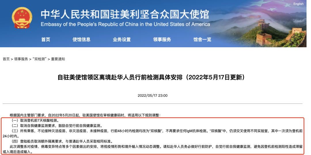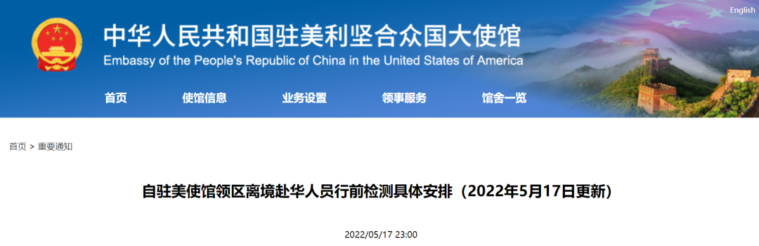 5月17日,中国驻美大使馆及中国驻旧金山总领馆、驻纽约总领馆、驻洛杉矶总领馆更新赴华人员行前检测最新具体安排。