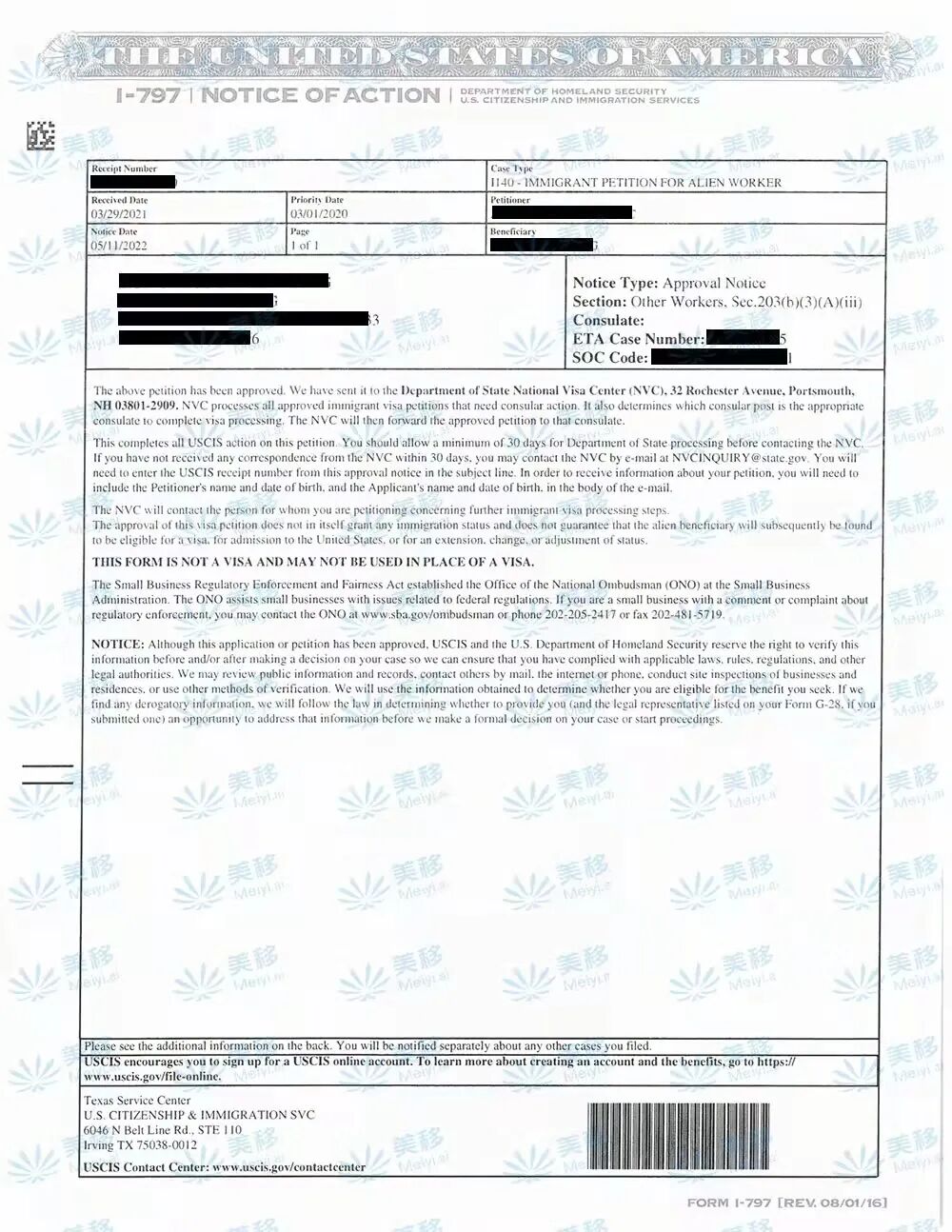 美移移民美国EB3雇主担保移民客户L女士,顺利获得移民批准函。