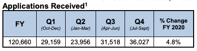 对比2020财年和2021财年的历史数据,我们可以直观地看到过去几个月职业移民绿卡的申请形势非常乐观。