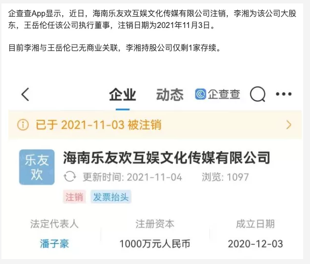 其实早在10月26日,就有网友扒出李湘、王岳伦已同时退出湖南看看好物网络科技有限公司,李湘卸任该公司执行董事职务和大股东,王岳伦卸任该公司法定代表人和经理职务。