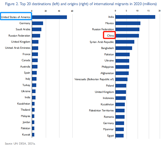 从移民流入国和迁出国而言,自1970年以来的50年,美国是最主要的移民流入国,从不到1200万国际移民增长了4倍,达到了2020年的超过5100万名国际移民。