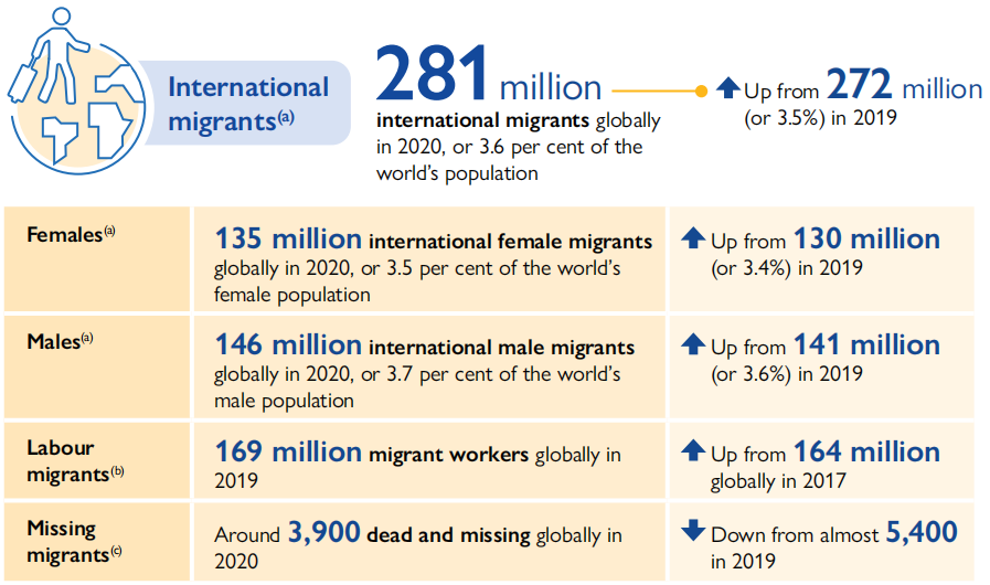 2020年全球移民约为2.81亿,比2019年的2.72亿增长了900万。报告也估算了疫情对国际人口流动的影响,新冠疫情可能使移民数量的增长减少了约200万人。