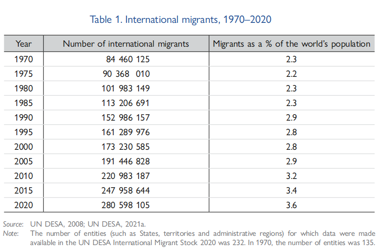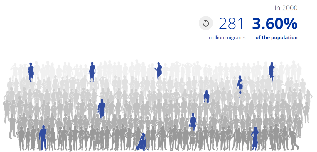 2020年,移民在全球总人口中所占的比例也有所增加,目前占比3.6%,这意味着每30人中就有1人是国际移民。