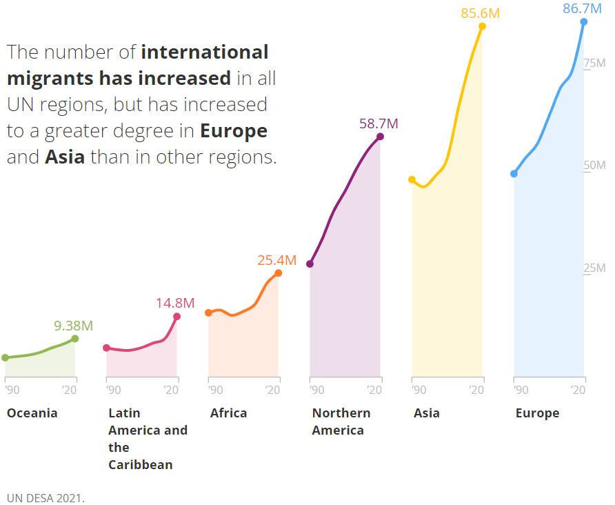 然而,从2000年到2020年,亚洲经历了最显著的增长,为74%。在此期间,欧洲经历了第二大增长,增加了3000万国际移民,其次是北美增加了1800万国际移民,非洲增加了1000万。