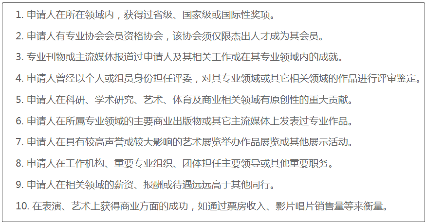 移民局提供了一些参考条件,以下至少提供以下10条中的其中三条,或其他具有可比性的至少三条杰出证据。