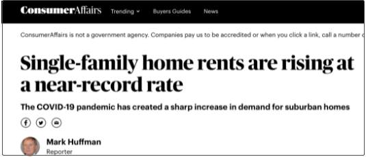 《华尔街日报》也曾报道,独栋别墅的租金也同样快速上涨。