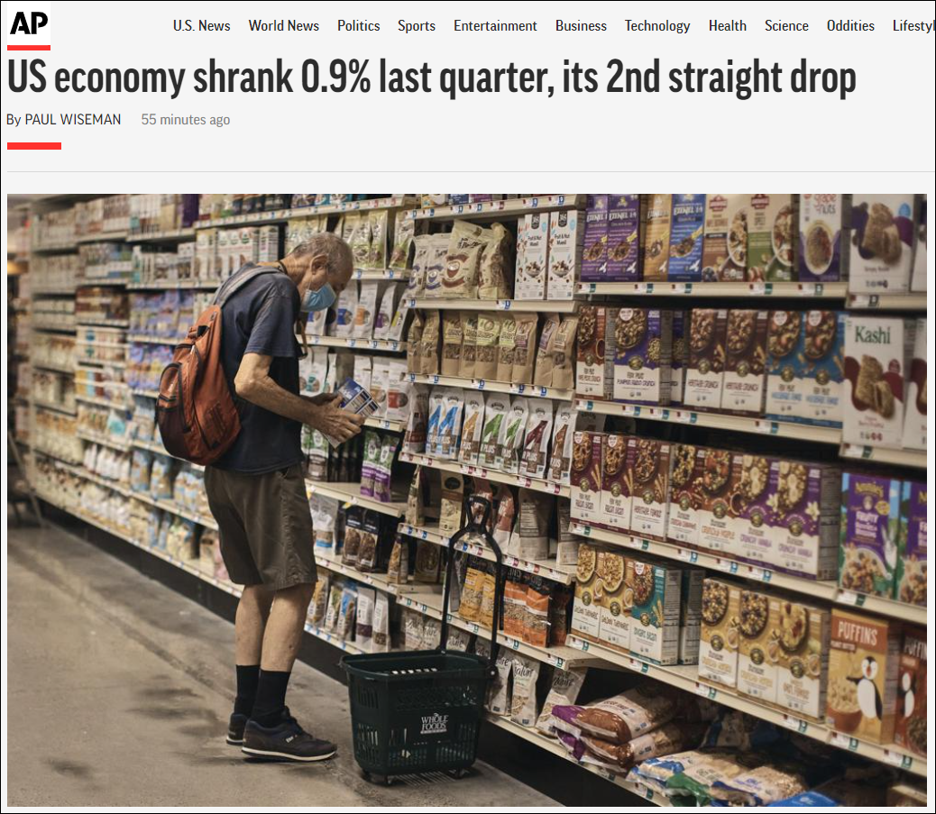 起因是近日美国商务部经济分析局公布数据显示,美国2022年第二季度GDP年化环比增长率(预估数据)为-0.9%。
