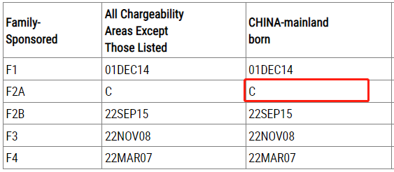 根据美国国务院发布的亲属移民排期表,对于中国大陆出生的申请人来说,F2A类(美国永久居民的配偶及未满21周岁子女)无需排期,有名额。
