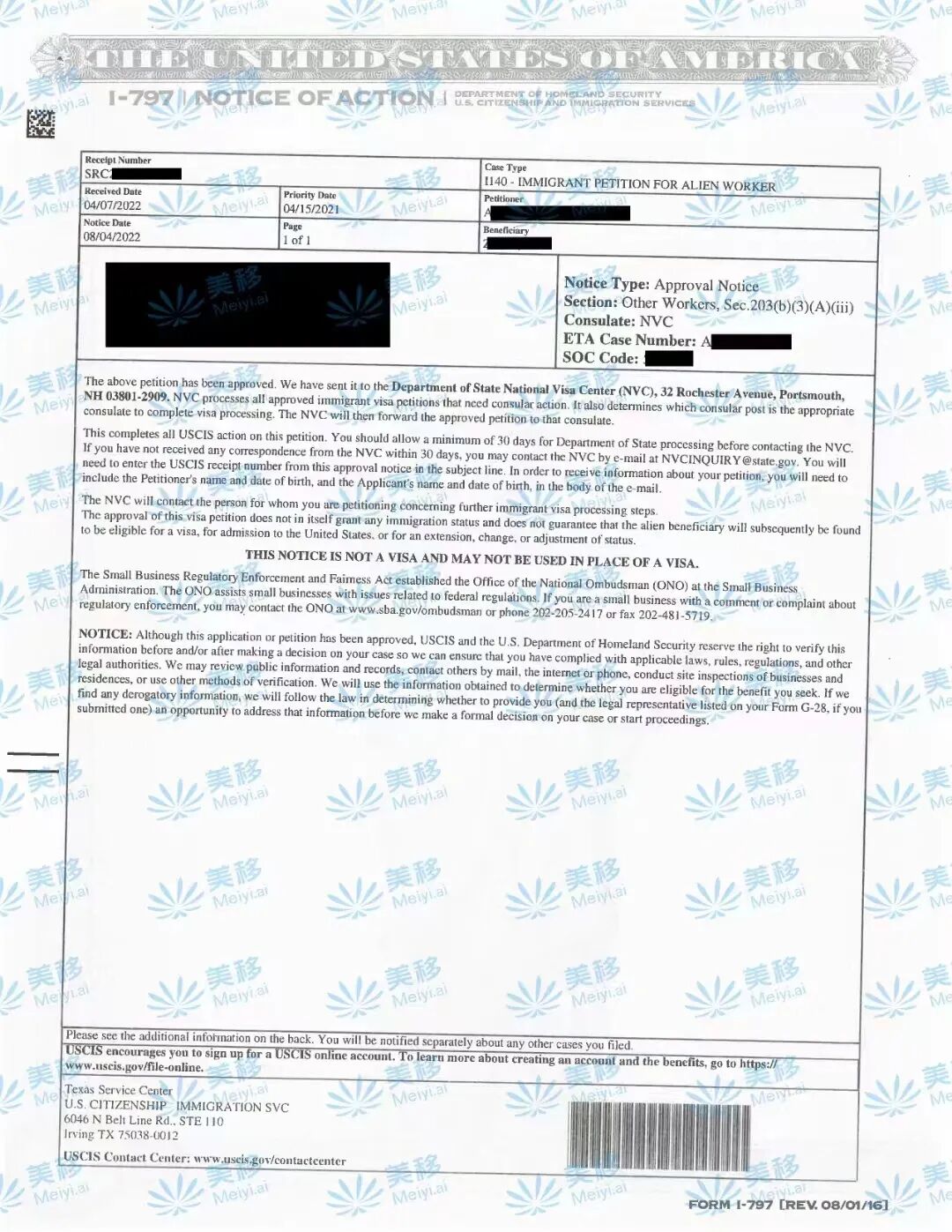 恭喜美移移民EB3雇主担保移民客户W先生顺利获得移民局批准函。