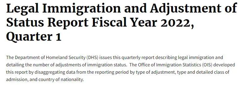 美国国土安全部(DHS)最新发布2022财年第一季度合法移民和身份调整报告,移民统计局(OIS)通过按调整类型、入境类型和详细类别以及国籍。