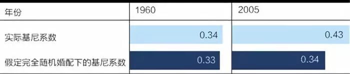 按照这一图表,从1960年到2005,如果美国社会的夫妻婚配完全随机,而与教育程度无关,那么基尼系数将会几乎毫无增长(从0.33变到0.34)。