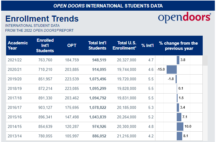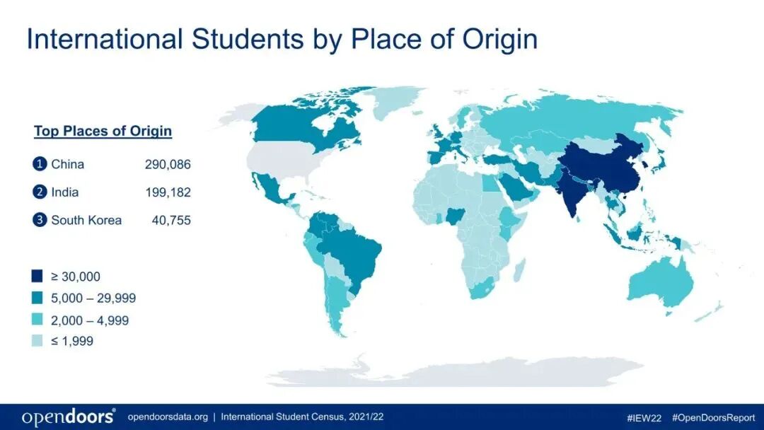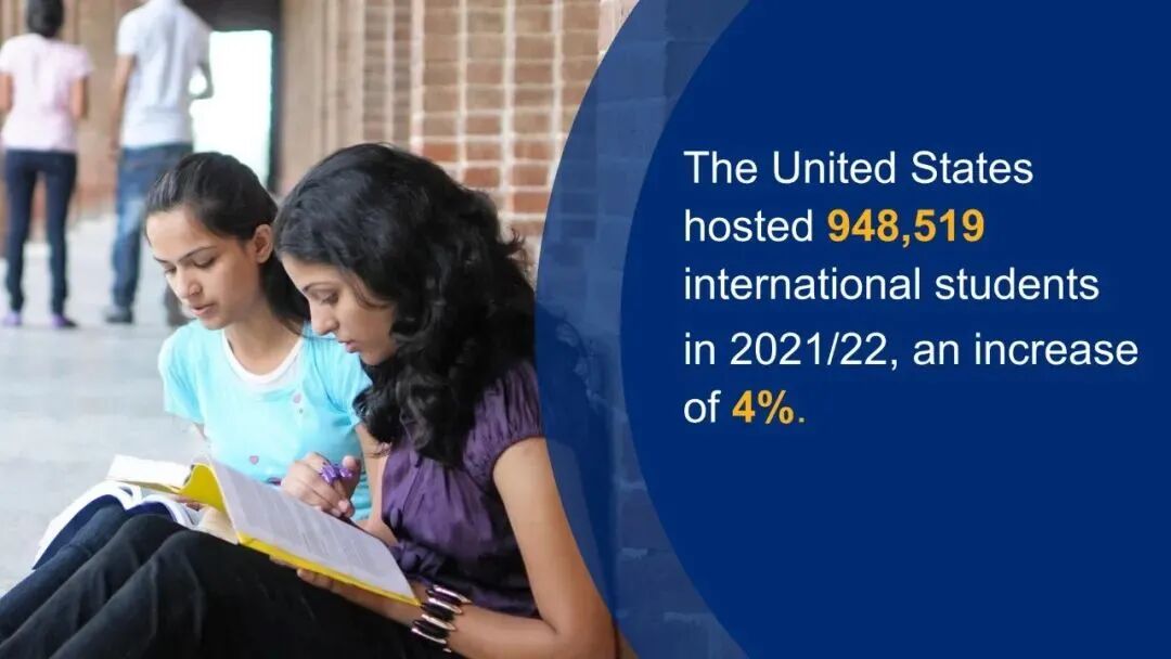 根据报告,2021-22学年美国在读国际学生总数为948,519万人,较上一学年的914,095人,增长了4%。