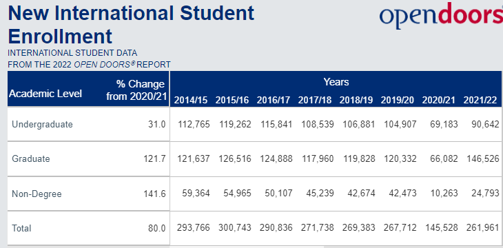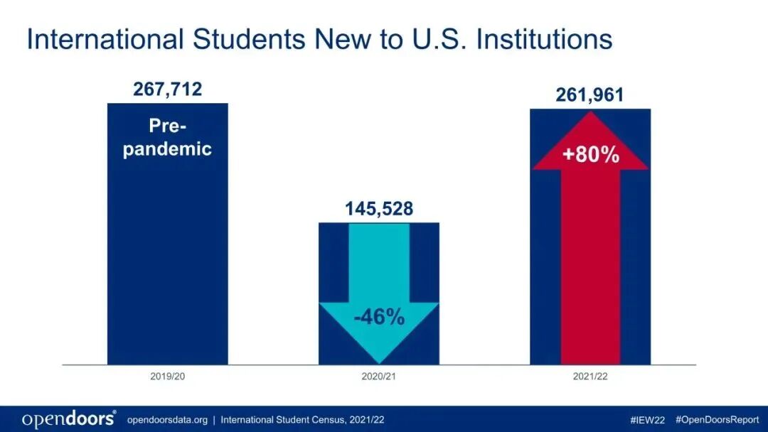 2021-2022学年国际新生人数出现猛增,同比增加80%,达到了261,961人。