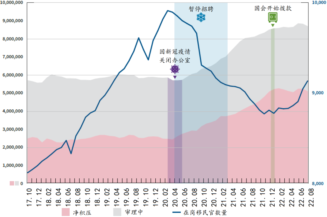 由于新冠疫情造成移民局财政危机和人手不足,从而导致案件积压加剧,如今进入后疫情时代,加之国会拨款,移民局逐步恢复了稳健的财政基础,并扩大招聘补充人手、加强技术投资、进一步改进业务,以期提高效率,改善客户服务。