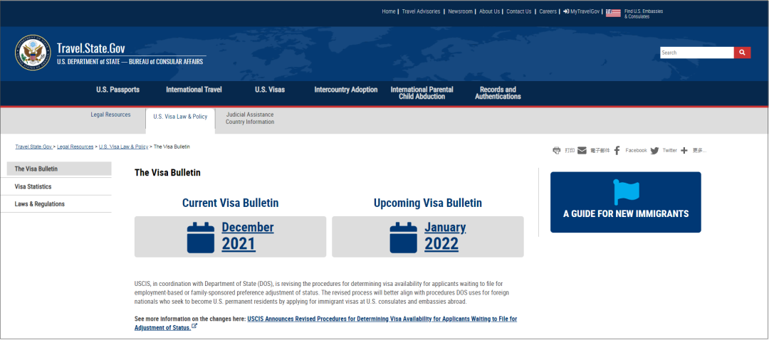 本周四,美国国务院公布了2022年1月的绿卡移民排期。