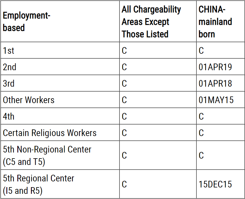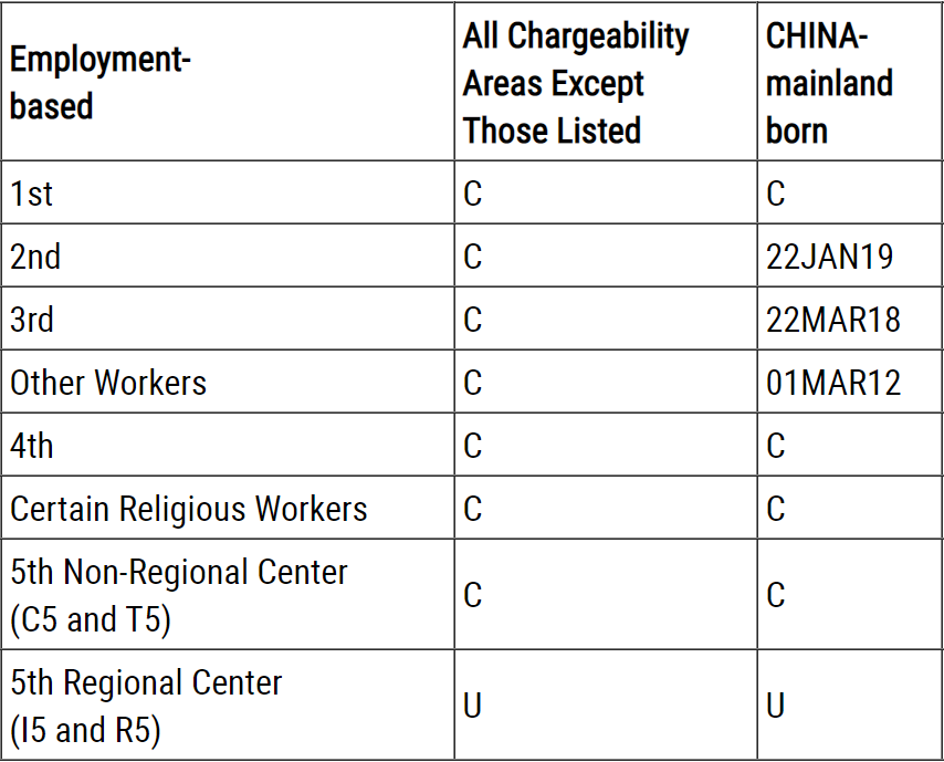 EB2(具高等学位或特殊能力者)排期前进21天,来到2019年1月22日;