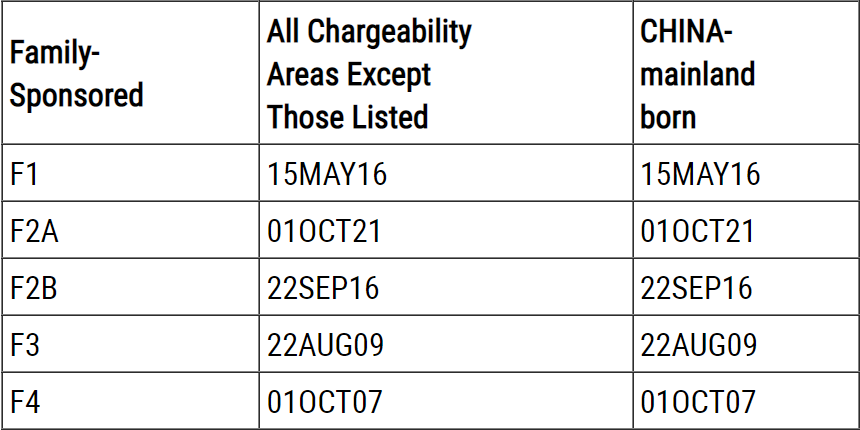 根据亲属移民排期表A,对于中国大陆出生的申请人来说:
